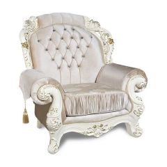 Красивое название для красивого кресла. Акцент сделан на богатый резной декор каркаса молочного цвета. Его цветочные мотивы изящно сочетаются с рисунком сидения. Два варианта исполнения ткани: бежевое золото или бирюза.