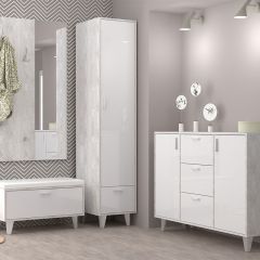 Состоит из: 3-х выдвижных ящиков, зеркала, стеллажа с полками, расположенный за зеркалом.